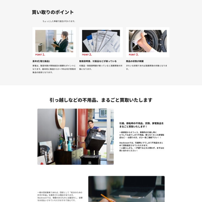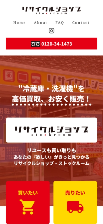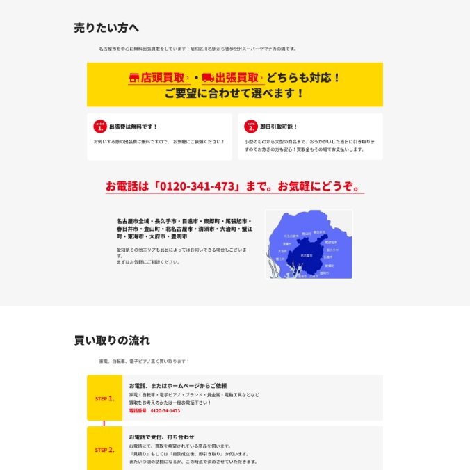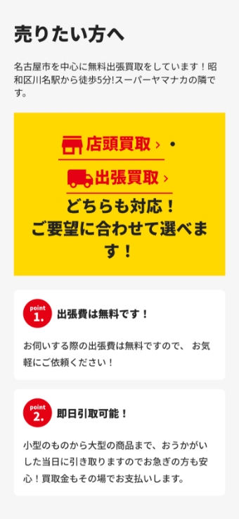店舗への集客と商品のオンライン訴求を同時に担う、買取希望者と購入希望者双方に向けた構成となっています。