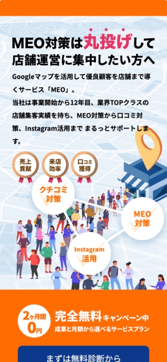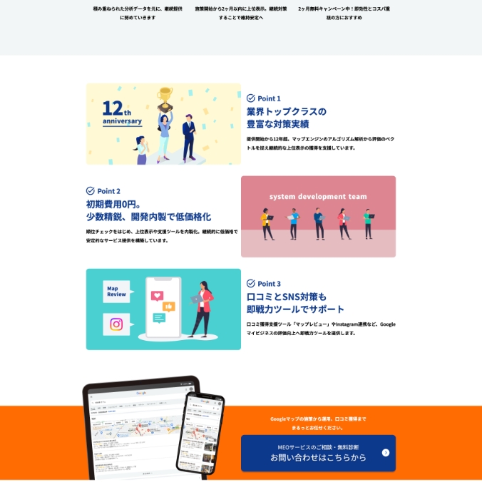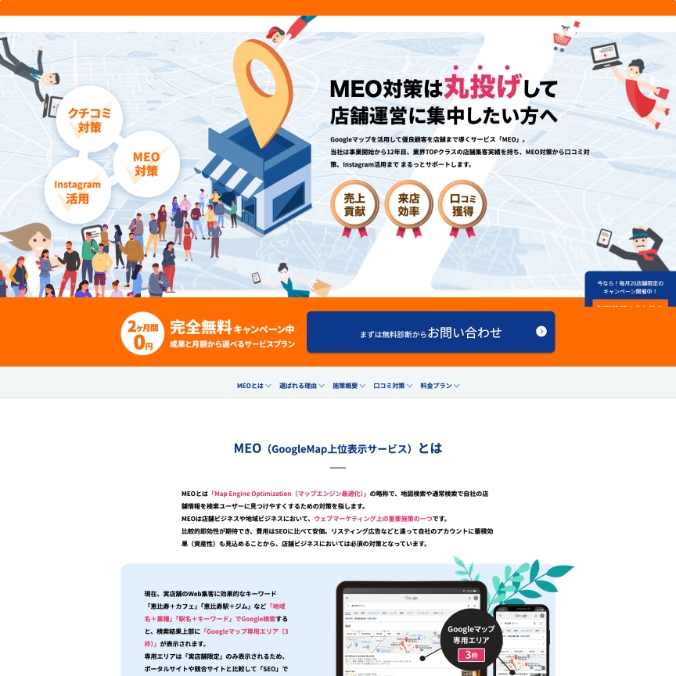 Googleマップ検索での上位表示(MEO)を目指す店舗やクリニック向けに、MEO対策を代行する法人向けサービスの紹介サイトの制作事例です。