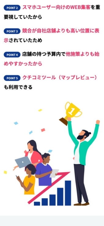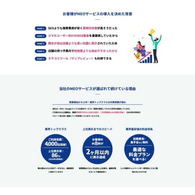 MEOの重要性や導入メリットにも図やイラストを多用したインフォグラフィック形式を採用し、潜在顧客の興味を引きつけています。