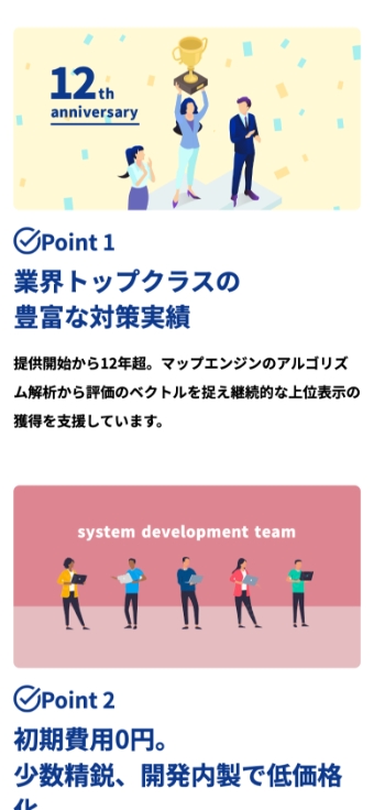 サービスとして何ができるのか、まるっとお任せいただけるというパッケージである事をしっかりと伝えつつ、成果での権威付けを意識して表示しました。