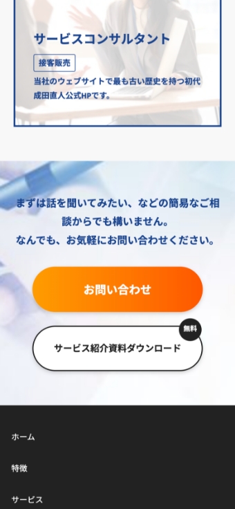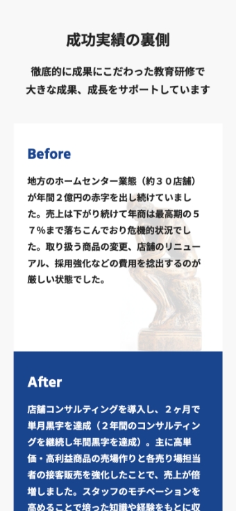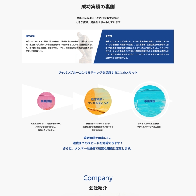 サイトのトーンもロゴカラーを基準にした落ち着いたデザイン方向性にし、キービジュアルで当社のコンサルティングを受けることで成功する未来のイメージを表現しました。