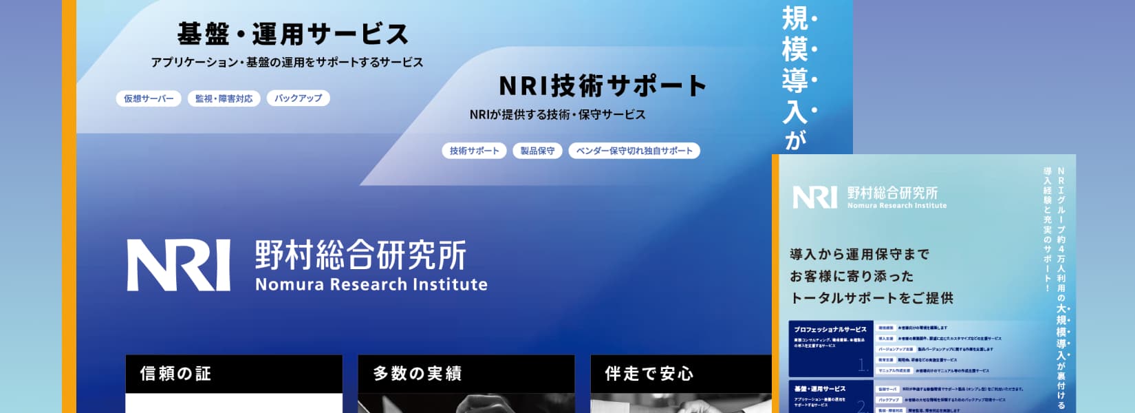 NRI様のデザインガイドラインに則り、企業イメージを感じさせるカラーと先進的なグラデーションパターンで制作しました。